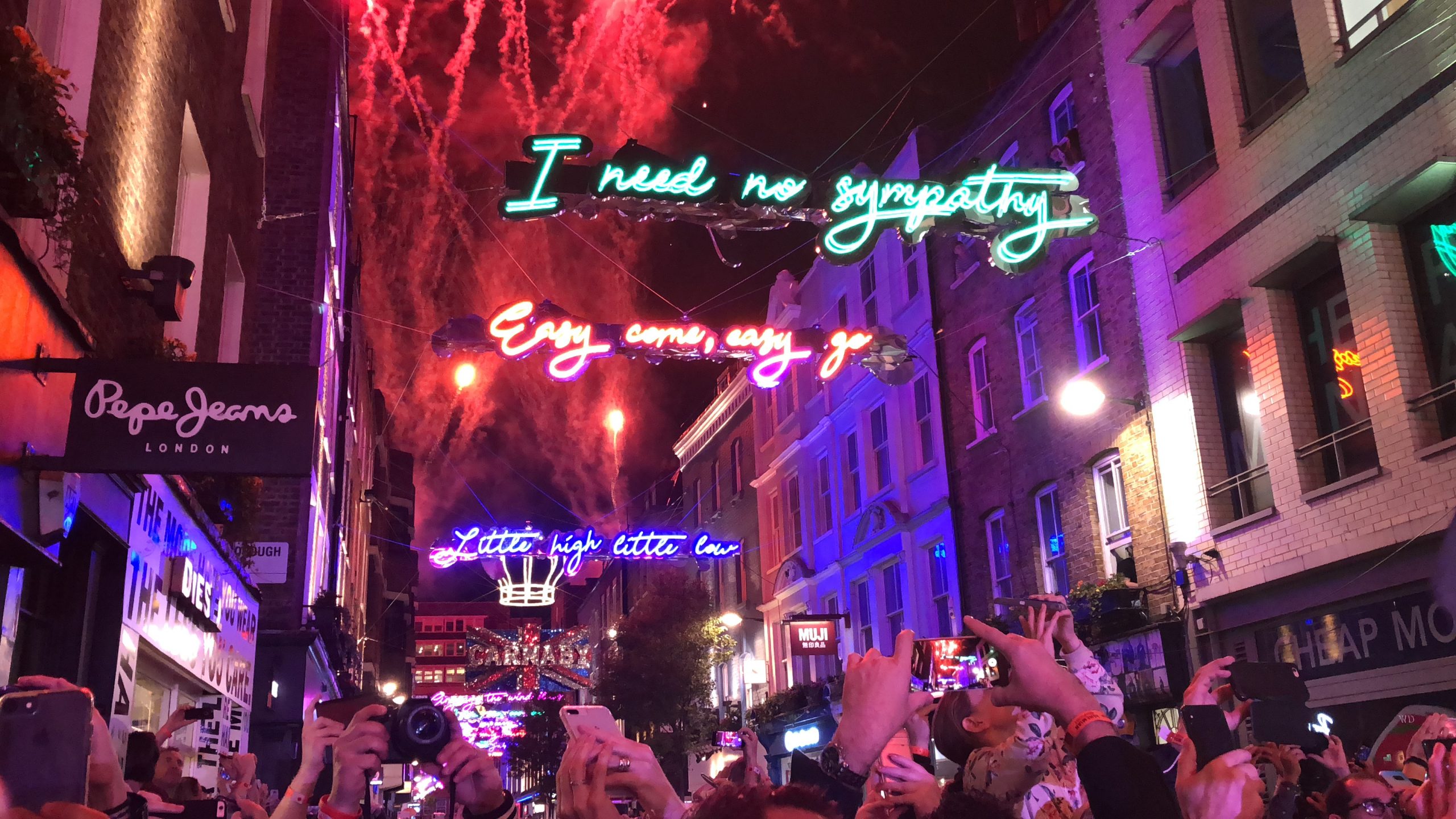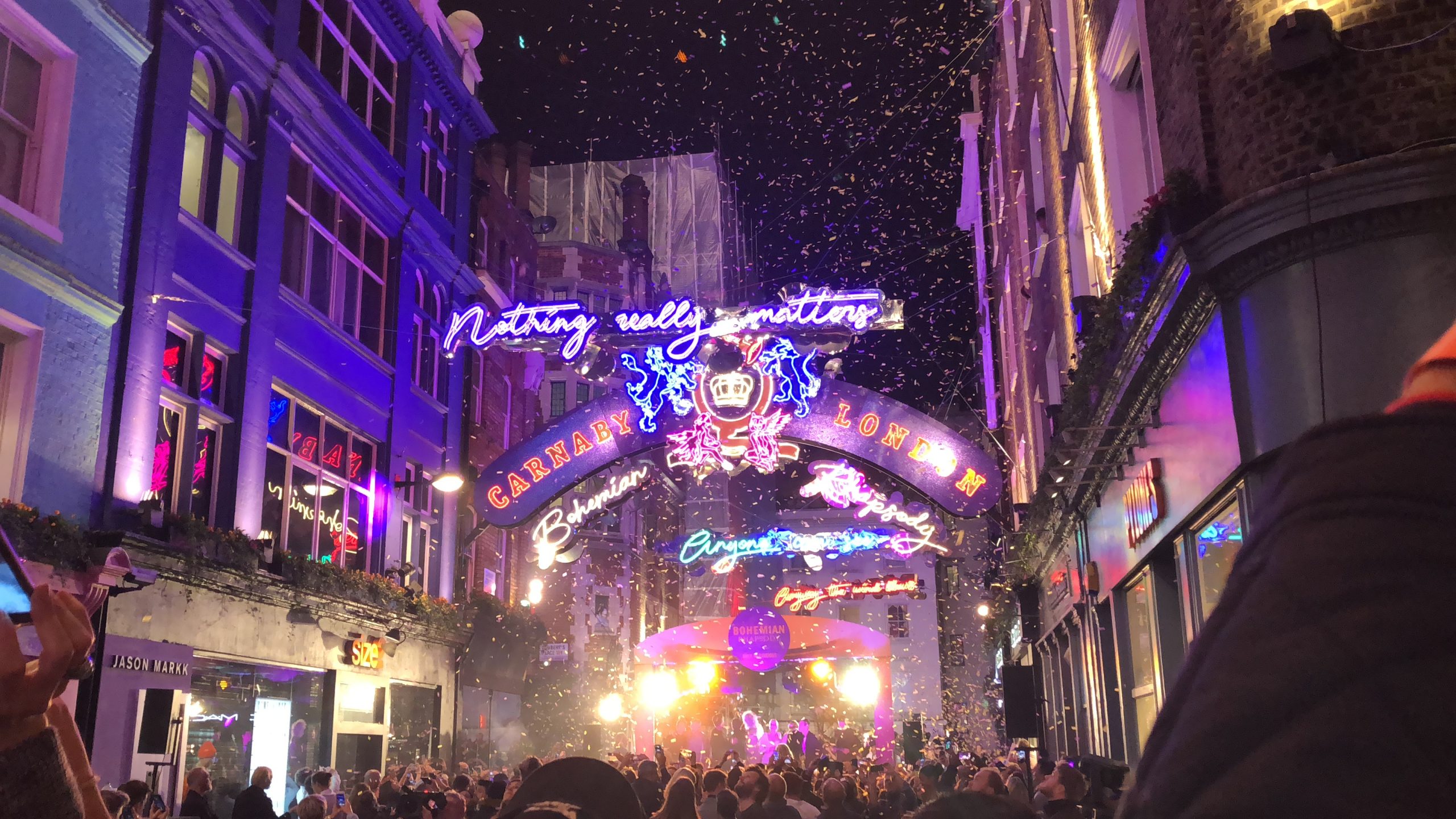 The theme of the display this year is all things Queen, with the lyrics to Bohemian Rhapsody put in neon lights along the whole length of the street.