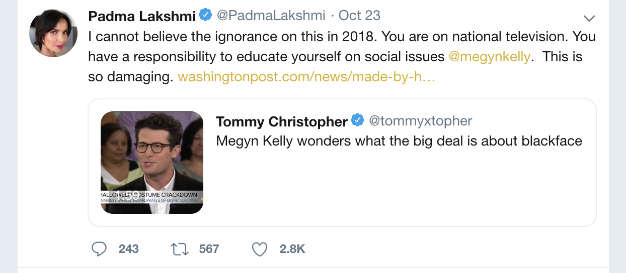 Here’s an example: On Tuesday morning, the NBC show host Megyn Kelly doubted whether there was any issue with blackface and white people dressing in blackface for Halloween. The comments come after centuries of white people donning blackface in an effort to dehumanize black people.