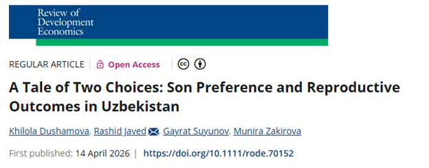 Dushamova, K., R.Javed, G.Suyunov, and M.Zakirova. 2026. “A Tale of Two Choices: Son Preference and Reproductive Outcomes in Uzbekistan.” Review of Development Economics, 1–16. https://doi.org/10.1111/rode.70152.